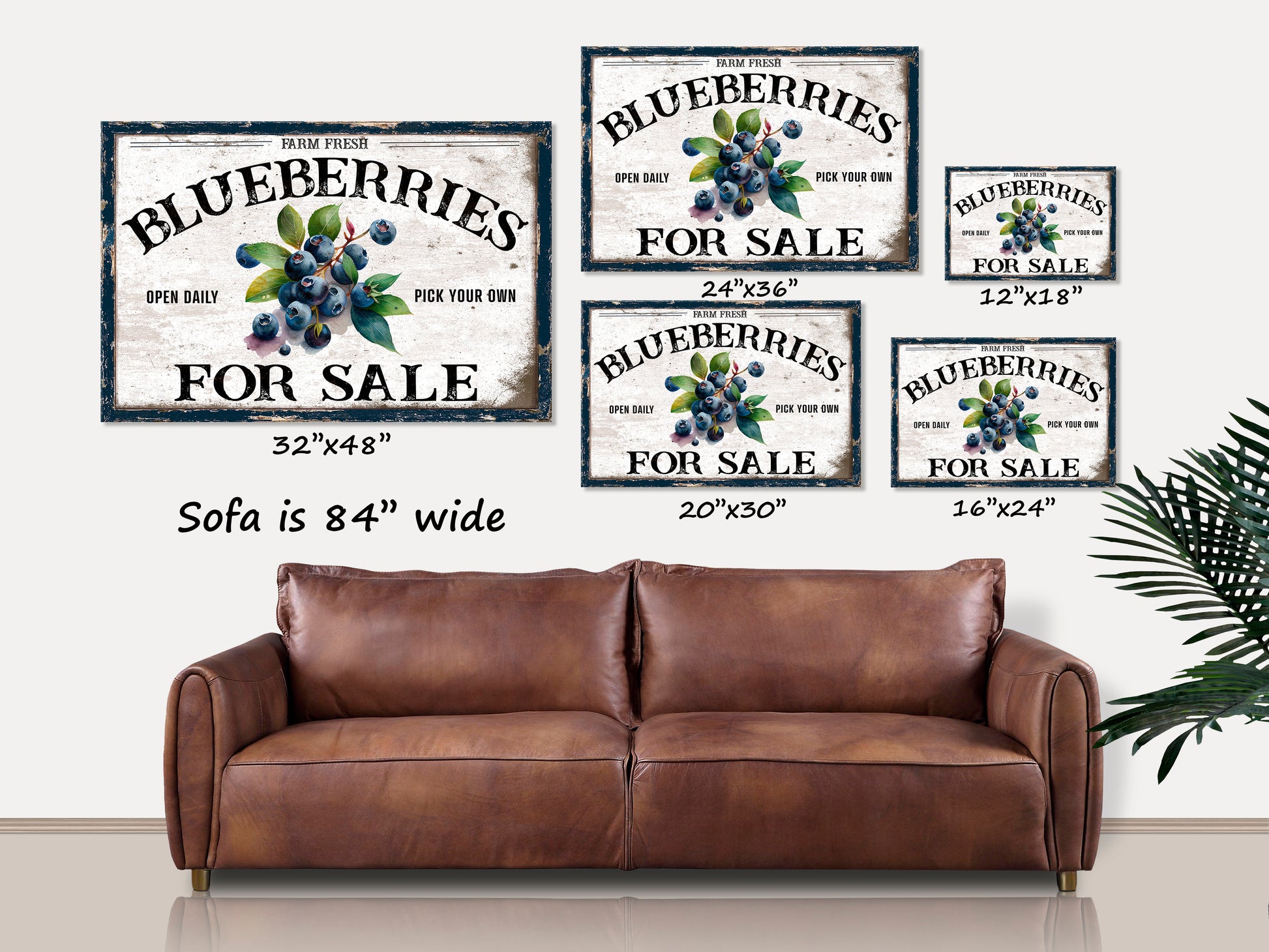Bring farmers-market charm to your home with this vintage-style canvas wall art featuring a bold “Blueberries For Sale” headline and a cluster of ripe berries. A distressed navy border, cream backdrop, and timeworn lettering give it that well-loved produce-stand look—perfect for adding fresh, summertime color to your kitchen or pantry year-round.