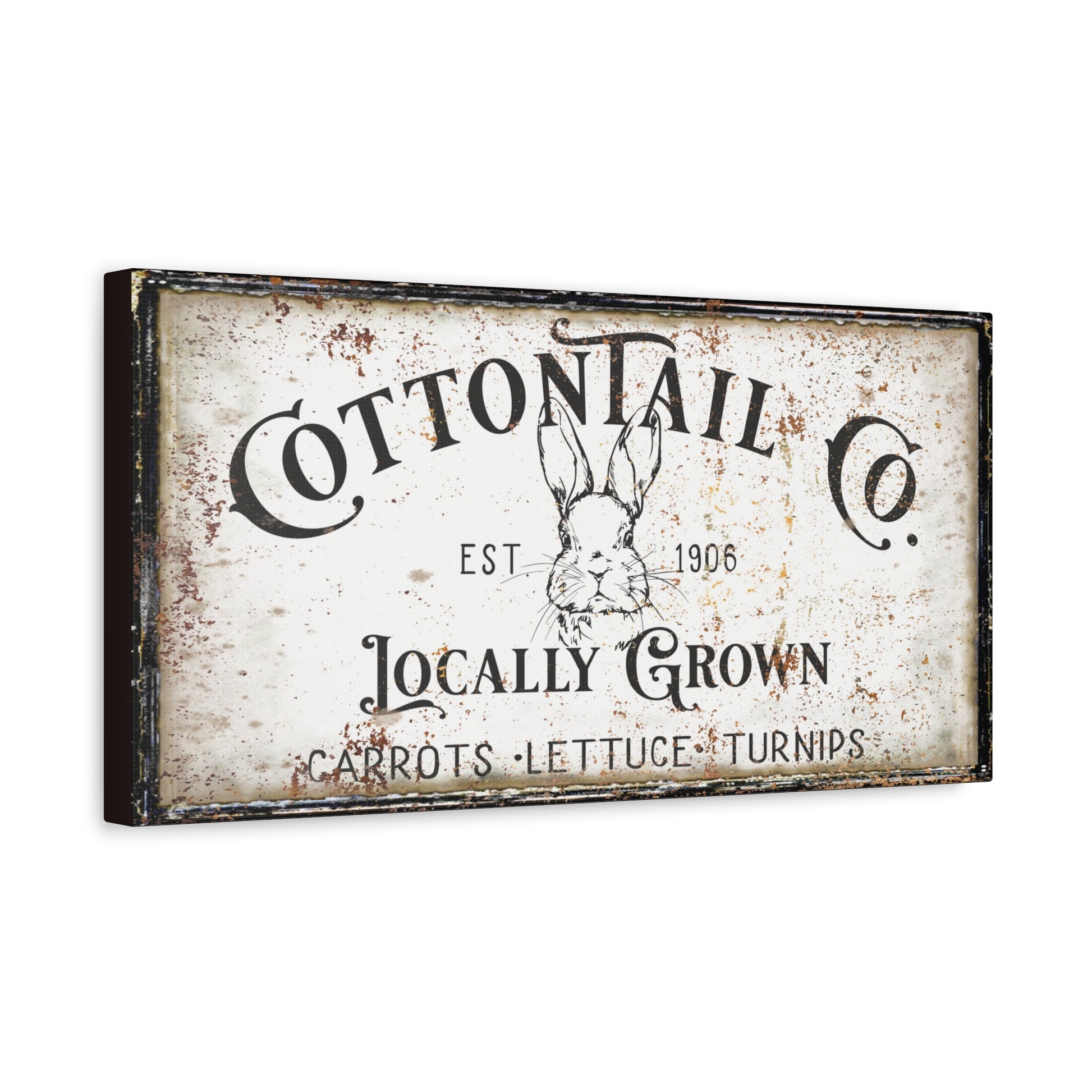 Bring a nostalgic countryside charm into your home with our “Cottontail Co. – Locally Grown” canvas sign. This beautifully distressed piece features a vintage-inspired black-and-white design centered around an illustrated bunny and the elegant typography of a fictional produce company established in 1906.