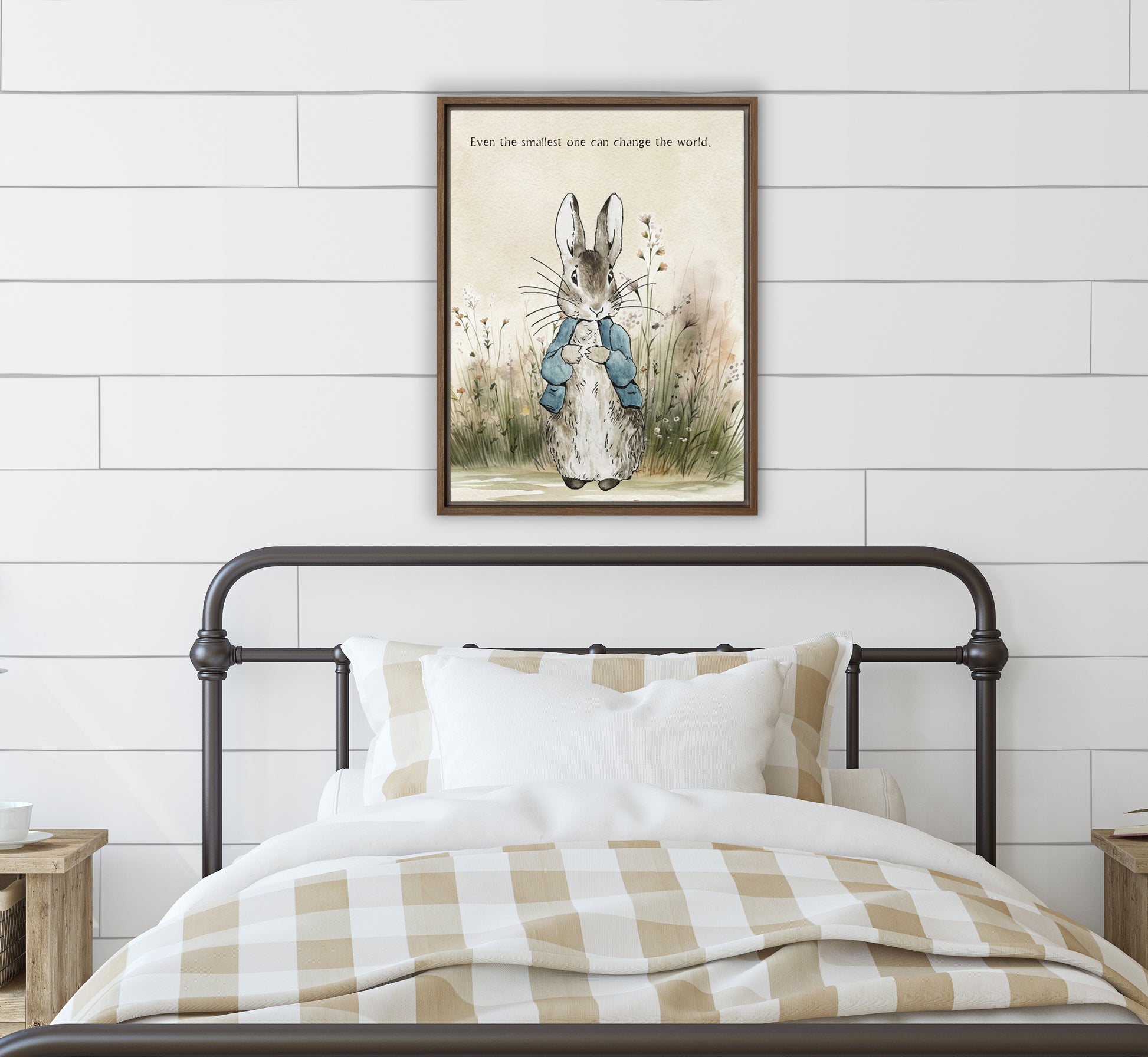 A sweet, storybook-style bunny stands in a meadow under the empowering line, “Even the smallest one can change the world.” This wood-framed canvas wall art brings soft watercolor textures and calming greens, creams, and warm neutrals to add comfort and quiet confidence to any child’s space.